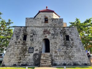 IPINATAYO NG MGA PARING RECOLETOS SA PATRONATO NI SAN VICENTE FERRER LABAN SA PAGSALAKAY NG MGA PIRATANG MORO, 1796. YARI SA KORALES NA MAY HUGIS TATSULOK AS UNANG PALAPAG AT HEKSAGONAL SA IKALAWANG PALAPAG. NALIGTAS SA PAGKASIRA NOONG DIGMAANG FILIPINO–AMERIKANO AT IKALAWANG DIGMAANG PANDAIGDIG NANG SUNUGIN NG MGA PUWERSANG HAPONES ANG BAYAN NG MARIBOJOC, 1944. HALIMBAWA NG ARKITEKTURANG MILITAR NOONG PANAHON NG MGA ESPANYOL AT BANTAYOG SA KAHUSAYAN NG MGA LOKAL NA ARTISANO. IPINAHAYAG NA PAMBANSANG PALATANDAANG PANGKASAYSAYAN, 2009.