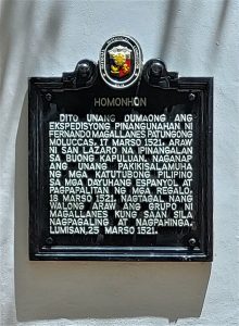 ON THIS ISLAND FERDINAND MAGELLAN’S EXPEDITION TO THE SPICE ISLANDS LANDED, 17 MARCH 1521, THE DAY OF SAINT LAZARUS WHOSE NAME WAS GIVEN TO THE WHOLE ARCHIPELAGO. NEARBY ISLANDERS CAME THE NEXT DAY TO MEET THE VISITORS WITH MAGELLAN’S SERVANT ENRIQUE FROM MALACCA AS INTERPRETER. THE GREAT NAVIGATOR EXTENDED TO THEM THE MESSAGE OF GOODWILL FROM THE KING OF SPAIN, WHICH WAS RECIPROCATED. A FEAST WAS HELD AND GIFTS EXCHANGED. EIGHT DAYS LATER, ON MARCH 25, THE CREW SAILED TO LIMASAWA, WHERE THE FIRST MASS IN THE PHILIPPINES WAS HELD, 31 MARCH 1521.