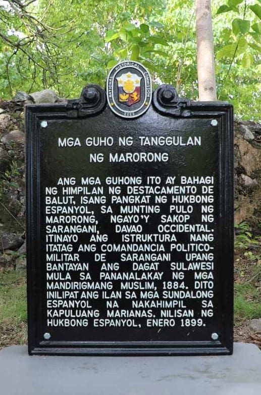 ANG MGA GUHONG ITO AY BAHAGI NG HIMPILAN NG DESTACAMENTO DE BALUT, ISANG PANGKAT NG HUKBONG ESPANYOL, SA MUNTING PULO NG MARORONG, NGAYO’Y SAKOP NG SARANGANI, DAVAO OCCIDENTAL. ITINAYO ANG ISTRUKTURA NANG ITATAG ANG COMANDANCIA POLITICO-MILITAR DE SARANGANI UPANG BANTAYAN ANG DAGAT SULAWESI MULA SA PANANALAKAY NG MGA MANDIRIGMANG MUSLIM, 1884. DITO INILIPAT ANG ILAN SA MGA SUNDALONG ESPANYOL NA NAKAHIMPIL SA KAPULUANG MARIANAS. NILISAN NG HUKBONG ESPANYOL, ENERO 1899.