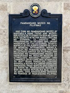 ANG DIWA NG PAMBANSANG MUSEO AY NAGSIMULA NANG ITATAG ANG MUSEO BIBLIOTHECA DE FILIPINAS SA BISA NG ISANG REAL NA DECRETO NI REYNA MARIA CRISTINA NG ESPANYA, 12 AGOSTO 1887. PINASINAYAAN, 24 OKTUBRE 1891. UNANG NAGBUKAS SA CALLE GUNAO, QUIAPO, MAYNILA AT KALAUNA’Y LUMIPAT SA CASA DE MONEDA, INTRAMUROS, MAYNILA. ITINULOY NG PAMAHALAANG INSULAR NG ESTADOS UNIDOS SA PILIPINAS ANG PAGTATAG NG PAMBANSANG MUSEO SA PAGBUBUKAS NG INSULAR MUSEUM OF ETHNOLOGY, NATURAL HISTORY AND COMMERCE, 29 OKTUBRE 1901, AT NAKILALA SA IBA’T IBANG PANGALAN. LUBHANG NAPINSALA NOONG IKALAWANG DISGMAANG PANDAIGDIG. PINAG-IBAYO PA ANG SERBISYO SA BAYAN NG PAMBANSANG MUSEO SA BISA NG BATAS REPUBLIKA BLG. 11333, 26 ABRIL 2019. NAGSISILBING TAHANAN NG PAMANA AT PAGKATAONG PILIPINO.