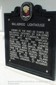 KILALA BILANG FARO DE PUNTA DE MALABRIGO. IDINISENYO NI GUILLERMO BROCKMAN BILANG TORENG PABILOG NA YARI SA LADRILYO, MAY HAGDANG METAL, PABELYON AT SILID PANGMAKINARYA, 1891. ITINAYO NI JOSE GARCIA, ISANG KONTRATISTANG TSINO, 1896. ISANG HALIMBAWA NG ESTILONG PANG-ARKITEKTURA NOONG PANAHON NG MGA KASTILA. NAGSILBING GABAY-TANGLAW NG MGA SASAKYANG PANDAGAT NA DUMARAAN SA PASAJE DE ISLA VERDE. IPINAHAYAG NA PAMBANSANG PALATANDAANG PANGKASAYSAYAN, 27 NOBYEMBRE 2006.